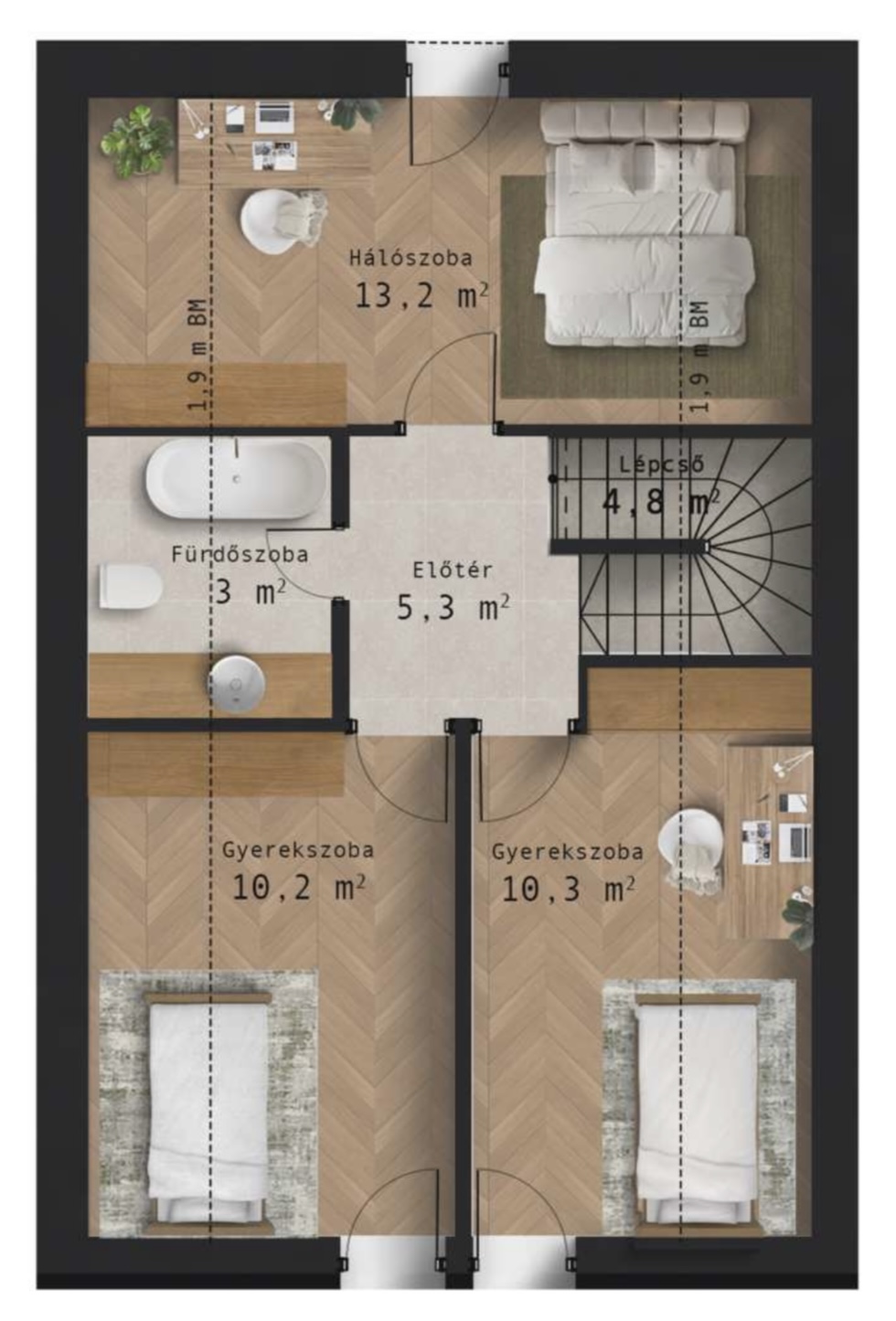 • 110 m2 floor area, 500 m2 plot area: 2 floors: living-room + 4 bedrooms: