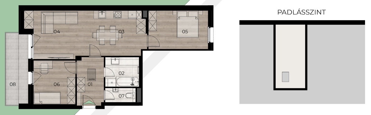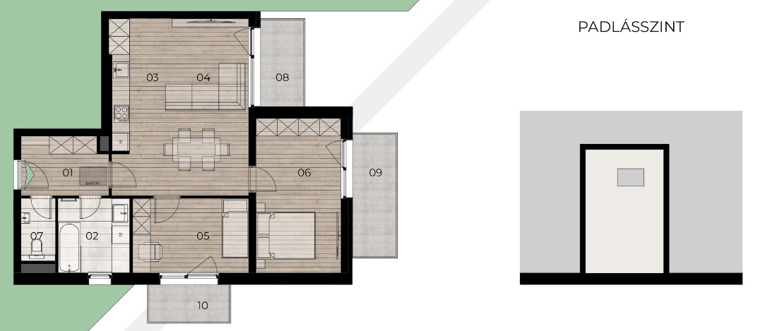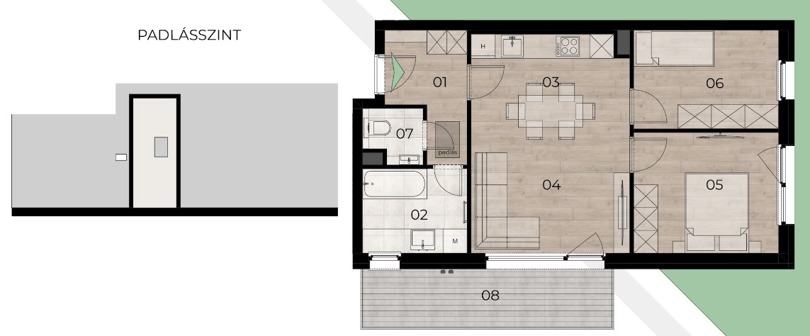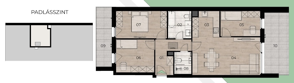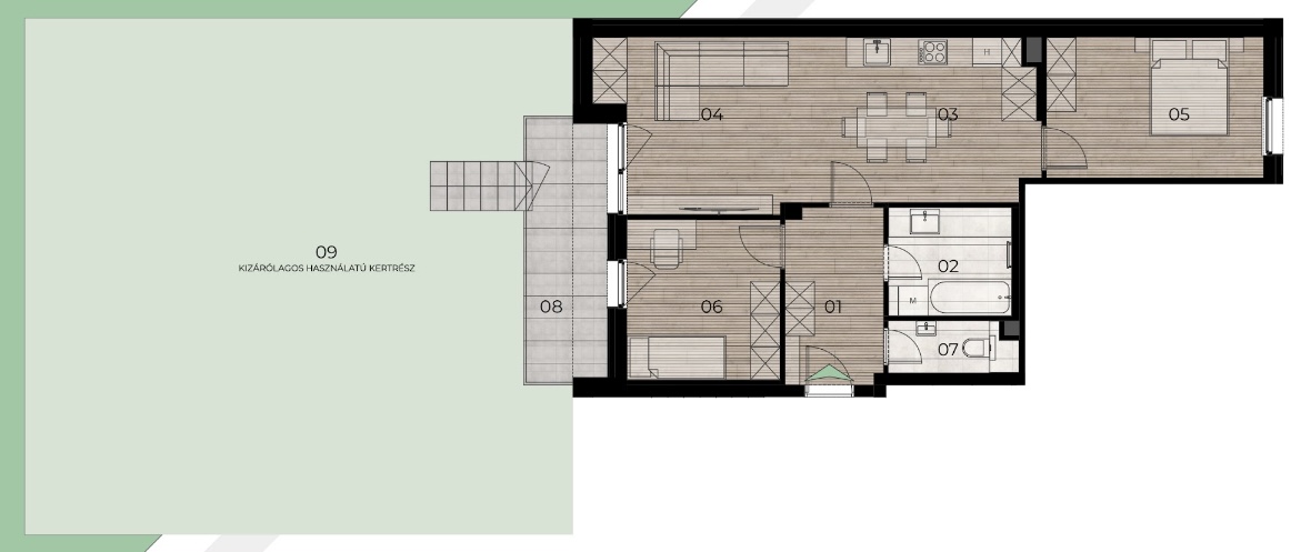 • Egyedi lehetőségek: az első emeleti hátsókerti lakáshoz (B épület) 137 m²-es kizárólagos kertkapcsolat, míg a legfelső emeleti lakásokhoz 10-15 m²-es padlástér kizárólagos használati jog tartozik.