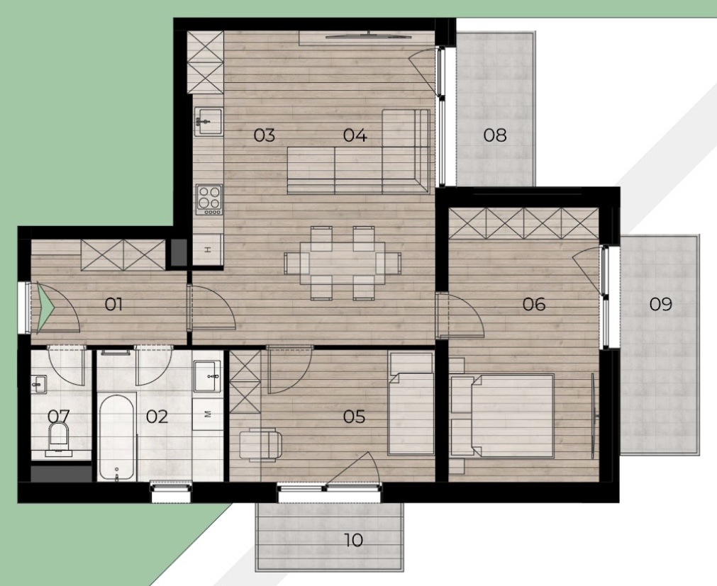 • Tágas, jól szerkesztett lakások: 54-80 m² közötti alapterület amerikai konyhás nappalival és 2-3 hálószobával.